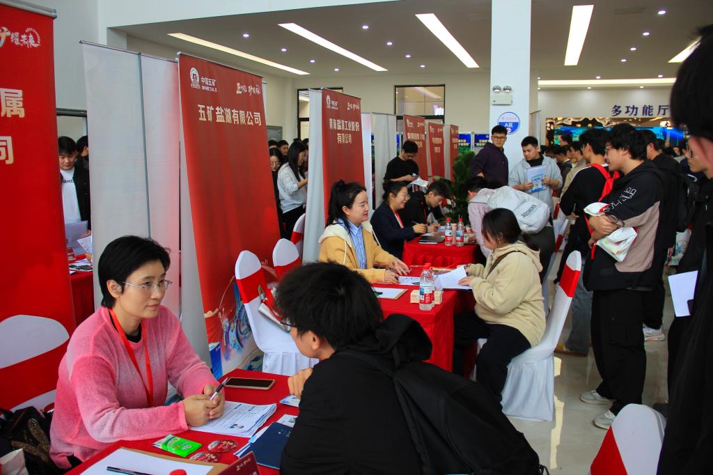 在双选环节,中国冶金科工股份有限公司、五矿有色金属股份有限公司、中国盐湖工业集团有限公司等20余家企业面向矿产类、冶金类、建筑类、材料类、地质类、环境类、信息类、机械类、能源类、财经类、商贸类、管理类等专业进行招聘,同学们踊跃参与,各企业咨询处排起长队,仔细询问岗位需求与要求,深入了解,并向负责人投递简历。