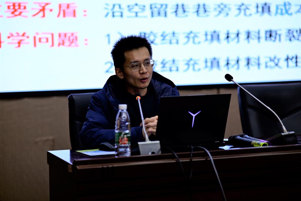 吴疆宇报告的主题为《分形矸石胶结充填材料的宏细观力学特性》。他指出,当前煤炭仍是我国主要能源,在煤炭地下开采留设煤柱造成的煤炭损失居矿井煤炭损失首位的背景下,通过巷旁胶结充填维护巷道稳定、减少掘进成本和煤炭损失、综合利用矸石可以实现矿山废物源头减量减害。他还列举了相关的研究成果,详细地解释了胶结充填材料的宏观力学特性、微观结构特征、细观力学仿真、细观破坏机理等。