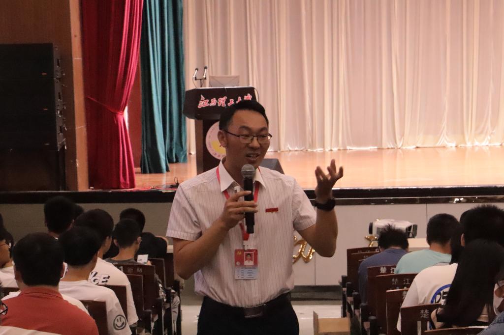 饶先发以一道接水谜题引导师生体会大学与高中思维方式的不同。又用新生合影和下宿舍所拍图片讲述了新生们初入大学校园的生活趣事。他提出,学生在大学重要的是学习怎样读书、怎样做事、怎样与人相处及怎样做人。