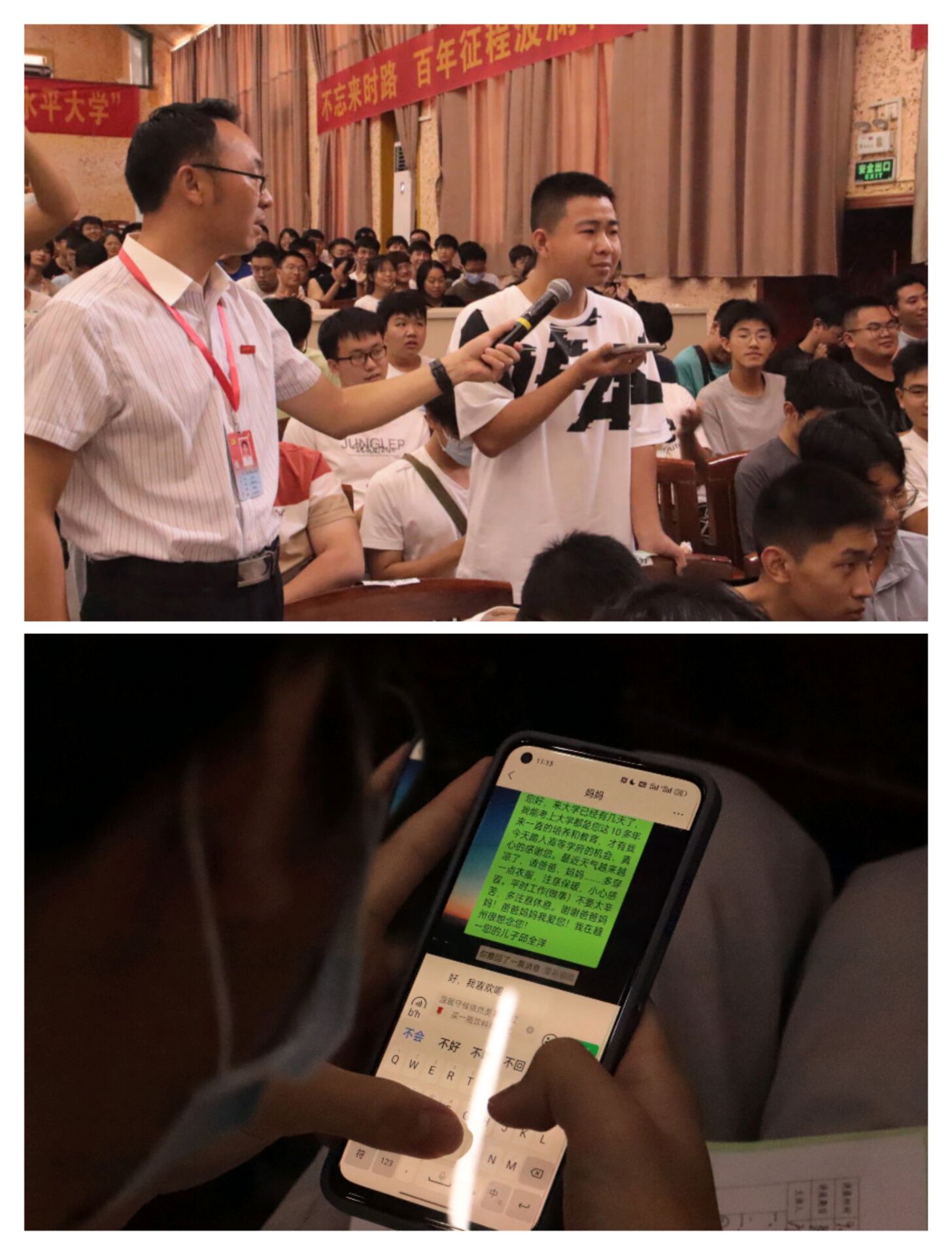 为了让新生在大学第一堂课学会感恩,饶先发让在座的每一位学生给父母发了一条感恩信息,一位安徽籍新生在他的鼓励下给母亲拨打了电话,对母亲亲口念出感恩语句,男孩的勇气引得现场掌声雷动。