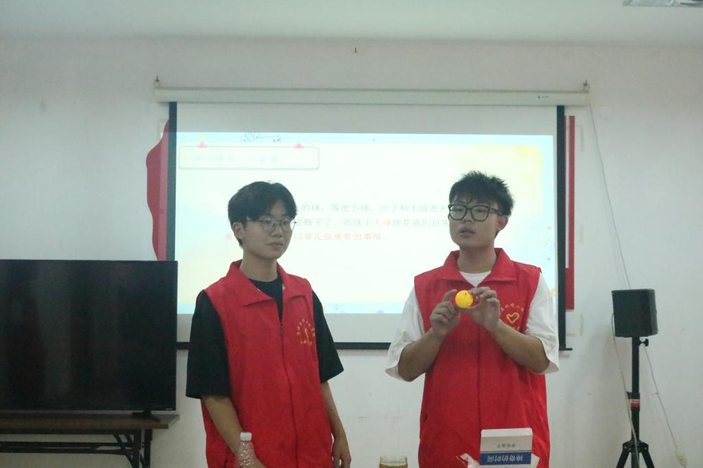 趣味实验部分,志愿者开展“谁偷走了我的时间”的趣味实验。志愿者拿出道具,边讲解边演示,“用大球代表大事,小球代表小事,沙子和水代表琐事,我们先装大球,然后再装小球,最后倒入沙子、水,这样瓶子就装满了,一天的‘时间’也就安排好了,但如果我先装沙子和水,那么情况又是怎样呢……”他们通过将道具装进水瓶的顺序和方法给小朋友们讲解了一天之中“大事”是最重要的、“小事”是其次,只有大事、小事、琐事按照顺序完成,时间才会被合理安排的道理。