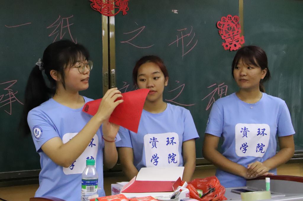 课上实践队队员用以“科技强国”“我爱中国”为内容的红色卡纸教导学生手工实践。同时实践队队员详细教学如何剪纸,向学生讲解了卡纸内容的寓意。为保证安全,每四位学生由一位实践队队员在一旁看护教学。在实践队队员和学生的共同的努力下,以爱国为主题的剪纸终于成型。实践队队员们和学生们都露出了开心的笑容。