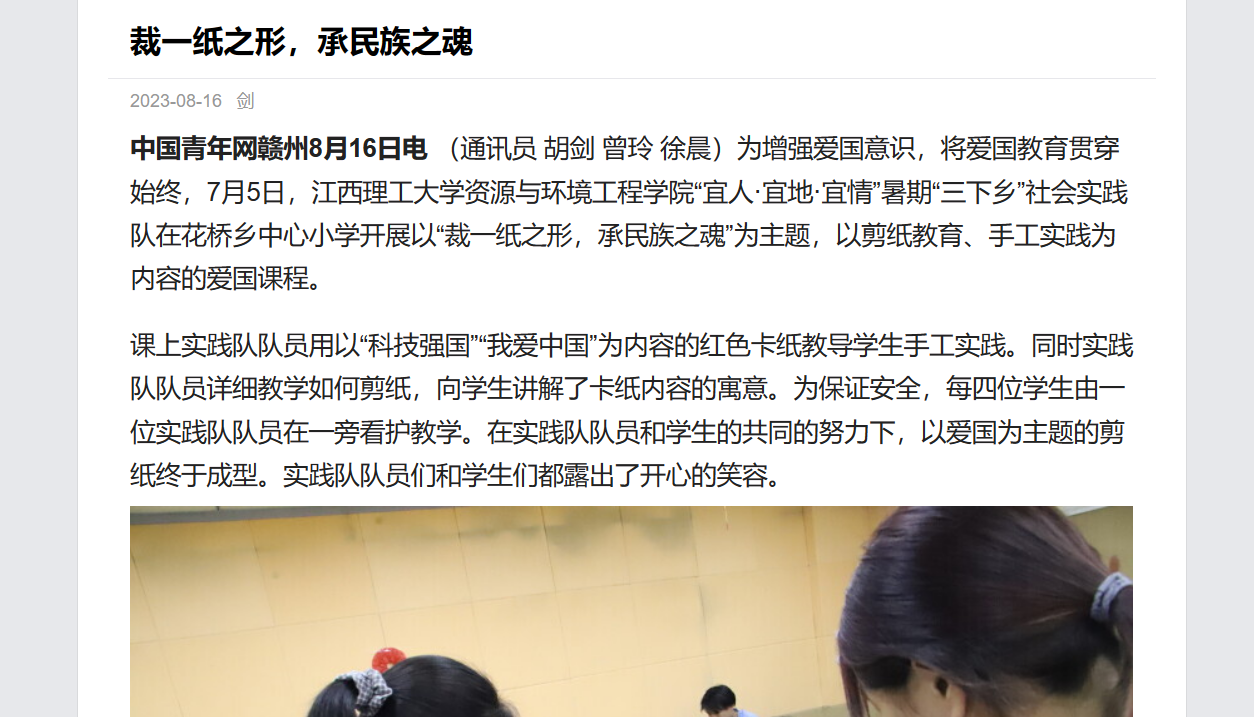 中国青年网赣州8月16日电 (通讯员 胡剑 曾玲 徐晨)为增强爱国意识,将爱国教育贯穿始终,7月5日,安博站官网登录入口“宜人·宜地·宜情”暑期“三下乡”社会实践队在花桥乡中心小学开展以“裁一纸之形,承民族之魂”为主题,以剪纸教育、手工实践为内容的爱国课程。