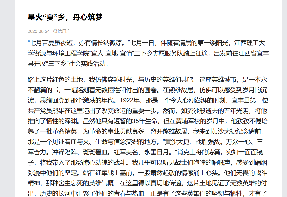 在实践中学习,在实践中收获,在实践中成长。在这期间有过争吵,也有过欢笑,流过汗,也流过泪。 “纸上得来终觉浅,绝知此事要躬行。”三下乡过程中能够亲身品味英雄的光辉事迹,亲身感受民生民情,亲眼见证祖国的大好山,对我来说受益匪浅。这种成长是一种思想和情感的升华,是由内而外的转变,让我变得更加成熟,更有责任感和使命感。三下乡虽然已经结束,但我却会将这份宝贵的经历永远铭记于心。(通讯员 匡奕)