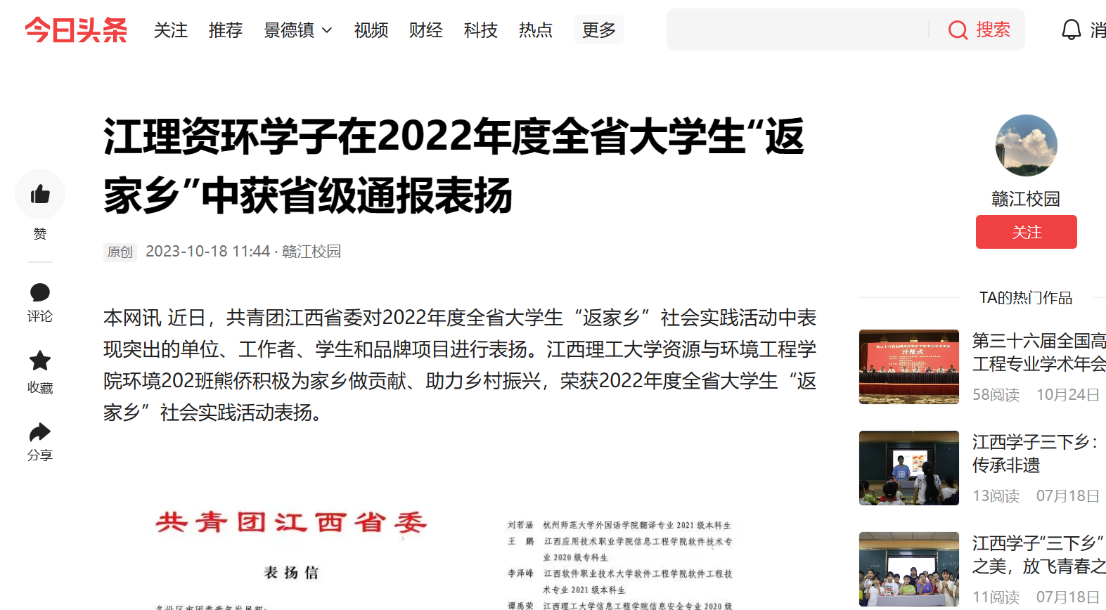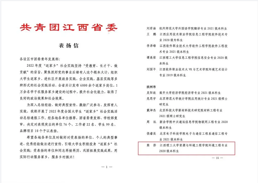 本网讯 近日,共青团江西省委对2022年度全省大学生“返家乡”社会实践活动中表现突出的单位、工作者、学生和品牌项目进行表扬。安博站官网登录入口环境202班熊侨积极为家乡做贡献、助力乡村振兴,荣获2022年度全省大学生“返家乡”社会实践活动表扬。
