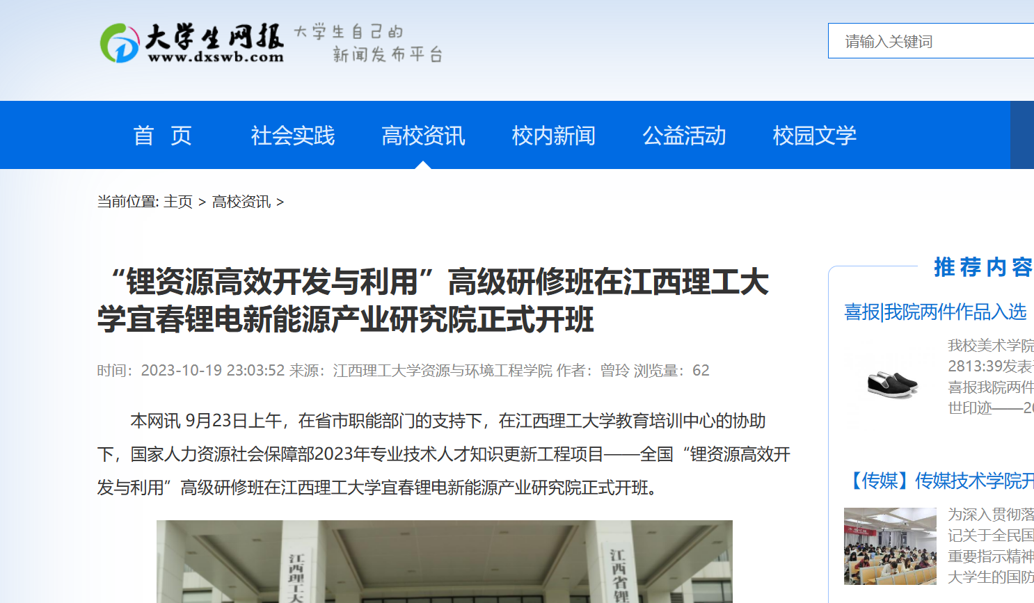 本网讯 9月23日上午,在省市职能部门的支持下,在江西理工大学教育培训中心的协助下,国家人力资源社会保障部2023年专业技术人才知识更新工程项目——全国“锂资源高效开发与利用”高级研修班在江西理工大学宜春锂电新能源产业研究院正式开班。