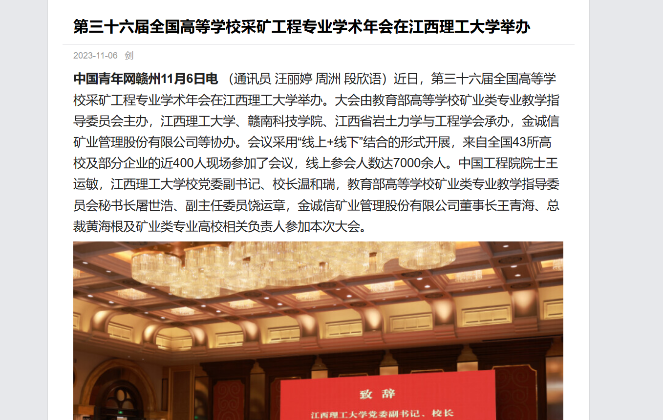 中国青年网赣州11月6日电 (通讯员 汪丽婷 周洲 段欣语)近日,第三十六届全国高等学校采矿工程专业学术年会在江西理工大学举办。大会由教育部高等学校矿业类专业教学指导委员会主办,江西理工大学、赣南科技学院、江西省岩土力学与工程学会承办,金诚信矿业管理股份有限公司等协办。会议采用“线上+线下”结合的形式开展,来自全国43所高校及部分企业的近400人现场参加了会议,线上参会人数达7000余人。中国工程院院士王运敏,江西理工大学校党委副书记、校长温和瑞,教育部高等学校矿业类专业教学指导委员会秘书长屠世浩、副主任委员饶运章,金诚信矿业管理股份有限公司董事长王青海、总裁黄海根及矿业类专业高校相关负责人参加本次大会。