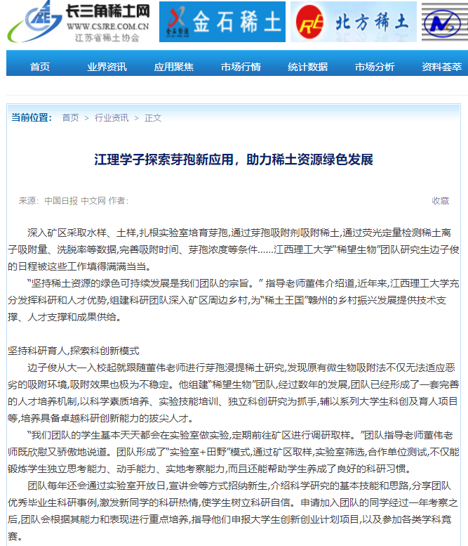 《长三角稀土网》:江理学子探索芽孢新应用,助力稀土资源绿色发展