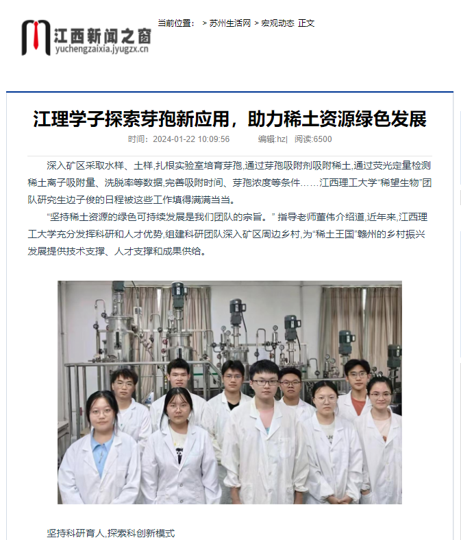 深入矿区采取水样、土样,扎根实验室培育芽孢,通过芽孢吸附剂吸附稀土,通过荧光定量检测稀土离子吸附量、洗脱率等数据,完善吸附时间、芽孢浓度等条件……江西理工大学“稀望生物”团队研究生边子俊的日程被这些工作填得满满当当。