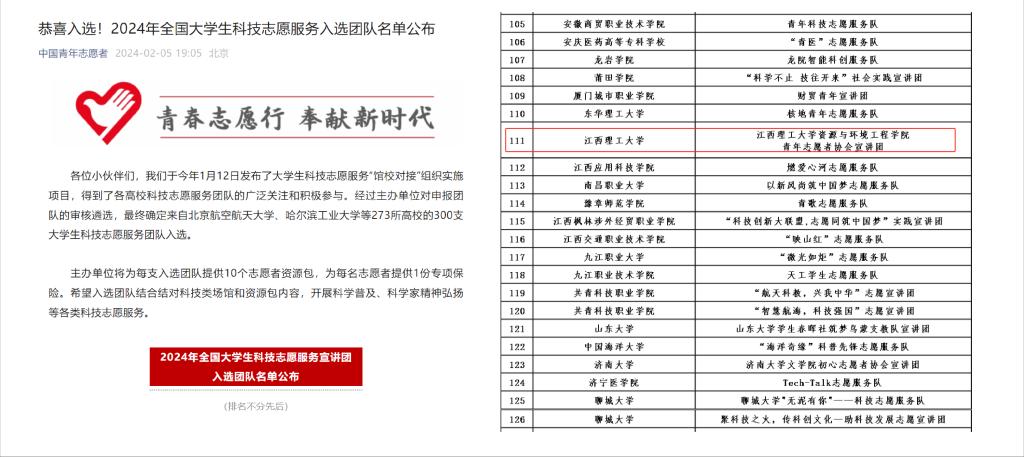 本网讯  2月5日,中国青年志愿者协会、中国科协宣传文化部公布了2024年全国大学生科技志愿服务宣讲团入选团队名单,我校资源与环境工程学院青年志愿者协会宣讲团成功入选,是学校唯一入选的团队。