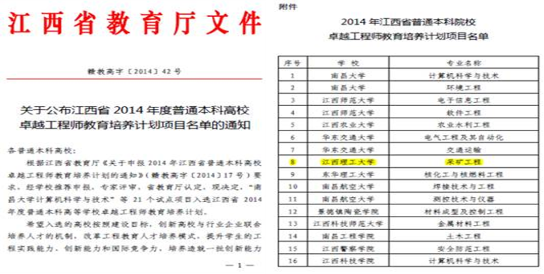 采矿工程专业创建于1958年,是我校最具特色和优势的专业之一。采矿工程专业为首批国家一流本科专业建设点、国家特色专业、江西省卓越工程师教育培养计划专业、江西省一流专业建设点、江西省高校品牌专业。通过3轮全国工程教育专业认证。2017年,入选江西省一流学科,在全省本科专业综合评价中排名第1。2018年获教育部批准与劳伦森大学合作开展本科教育4+0项目。同时,矿业工程为博士学位授权学科。经过60余年的传承与历史积淀,我校采矿工程专业为国家培养了大批人才,积累了丰富的办学经验,教学理念不断更新,教学质量稳步提高,具备了雄厚的学科基础和完整的课程体系,在国内采矿工程领域处于领先地位。